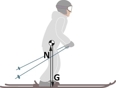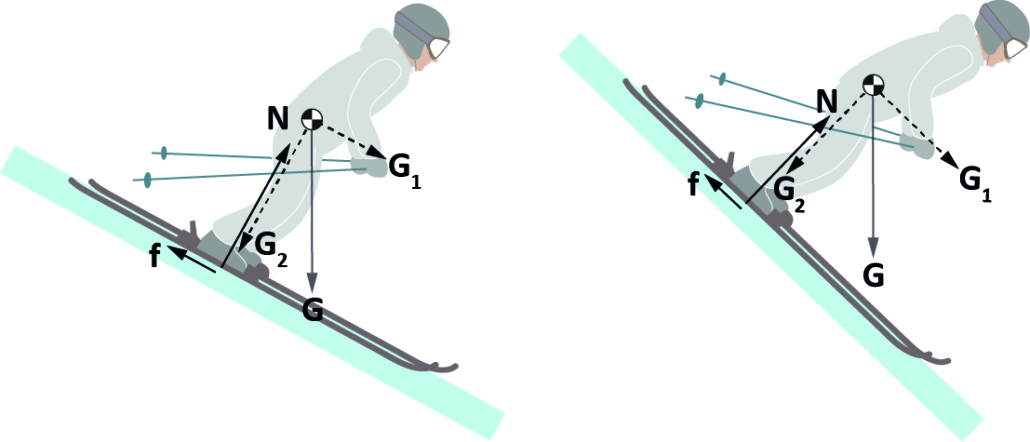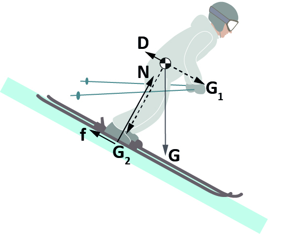 - G₂ är komposanten vinkelrätt mot underlaget, pressar skidåkaren mot marken och säkerställer kontakten med snön.