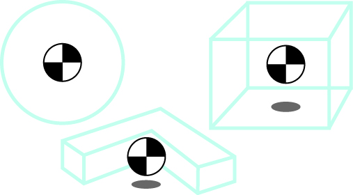 Bilderna ovan visar var masscentrum befinner sig beroende på objektets form och figur. Notera att masscentrum i vissa situationer kan hamna utanför föremålet.