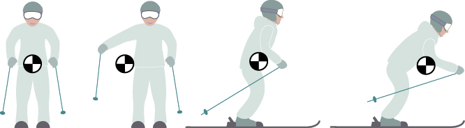 Som tidigare nämnt kan det vara svårt att fastställa var masscentrum befinner sig hos en skidåkare. En generell utgångspunkt är att den, hos en vuxen person, befinner sig mitt i kroppen i höjd med magen.