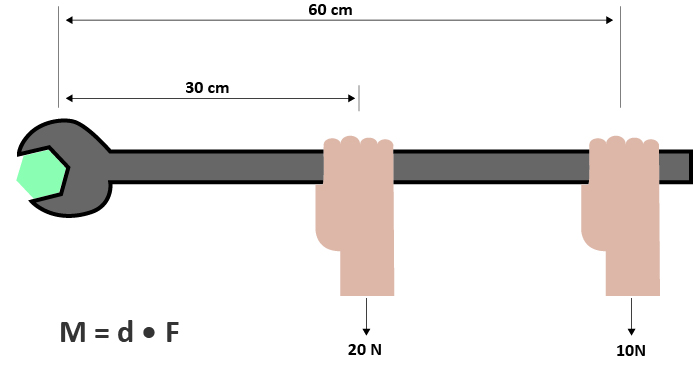Storleken på hävarmen bestäms av avståndet mellan rotationspunkten (den punkt föremålet roterar runt) och angreppspunkten (punkten där kraften appliceras). Ökar kraften från 10 N till 20 N kommer kraftmomentet bli dubbelt så stort. På samma sätt kommer kraftmomentet öka om hävarmen förlängs men kraften är konstant.